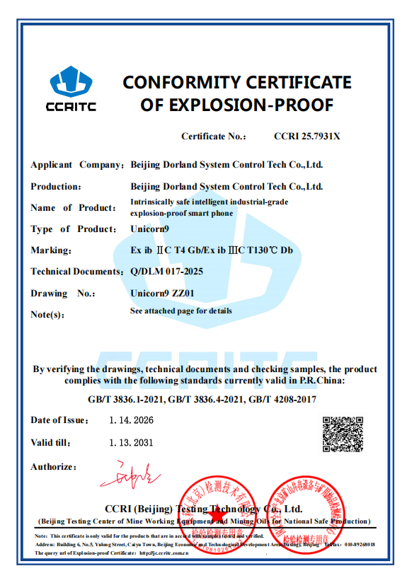 Beijing DORLAND System Control Technology Co., Ltd. recently introduced the intrinsically safe smartphone Unicorn9. It adopts advanced technology, intrinsically safe circuit design, domineering appearance and solid body. The mobile phone adopts 6.56 inch full screen (20:9) design, equipped with 8MP front and 50MP+8MP + thermal imaging camera at the rear. Its waterproof and dustproof performance meets the international IP68 standard.