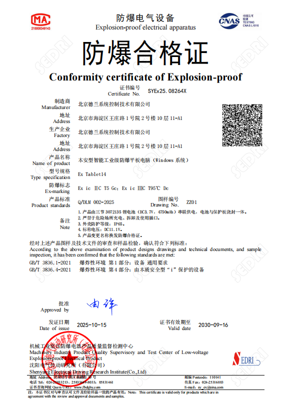 北京德兰系统控制技术有限公司最新推出本安型智能工业级防爆平板电脑(Windows系统)Ex Tablet 14,采用先进技术,本安型电路设计,外观霸气、机身坚固。本产品采用Windows 10/11操作系统和14英寸触摸屏设计,配有前置500万+后置800万像素摄像头,其防水、防尘性能达到国际IP65标准;此外,我们还在PAD内部配置了GPS/Glonass等多种适合户外施工、管道巡检等功能,可以配合OA办公系统、巡检定位系统、数据采集系统等多种应用。尤其适用于危险爆炸的恶劣环境,如石油、化工、制药、油库、罐区等具有可燃性和爆炸性气体的危险场所,方便使用者与生产、调度及时沟通。
