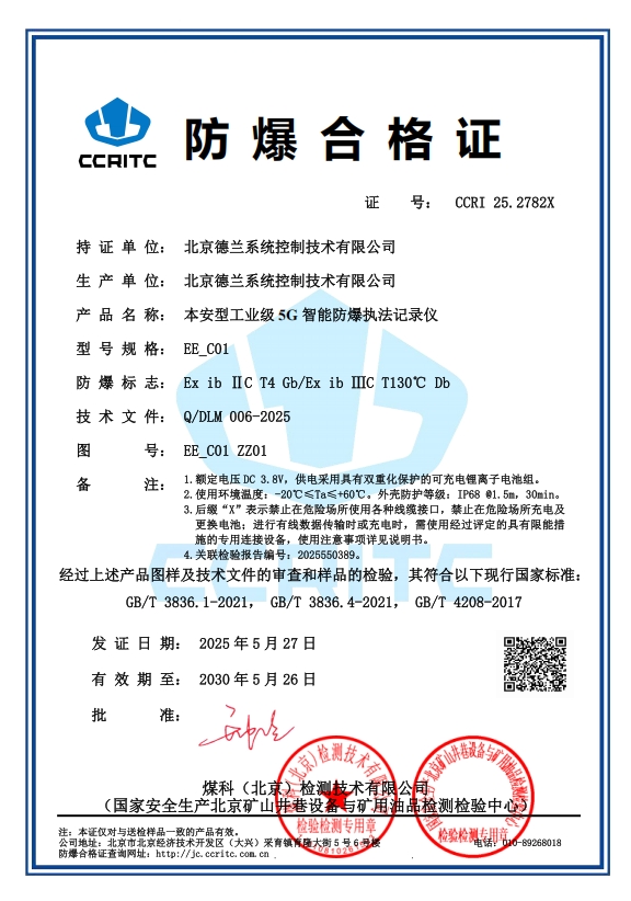 北京德兰系统控制技术有限公司最新推出本安型工业级智能防爆视频记录仪EE_C01,采用先进技术,本安型电路设计,外观霸气、机身坚固。4G高清视音频记录仪是专为记录监控环境开发的高度集成设备。设备支持拍照、录像、录音、本地存储、红外夜视、激光定位、3G/4G无线传输,可通过4G/3G/WIFI/AP网络环境将视频直接上传到后台,用户可通过手机、PC客户端观看前端回传的视频,满足各种场景记录需求。